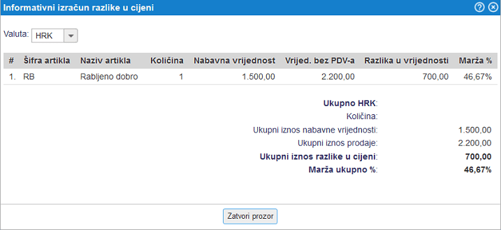 Kada na račun dodamo artikal kojeg smo prethodno upisali u šifrarnik/zaprimili primkom, tada se iz nabavne i prodajne cijene artikla – rabljenog dobra automatski izračunava razlika u cijeni iz koje se izračunava porezna osnovica i iznos PDV-a.