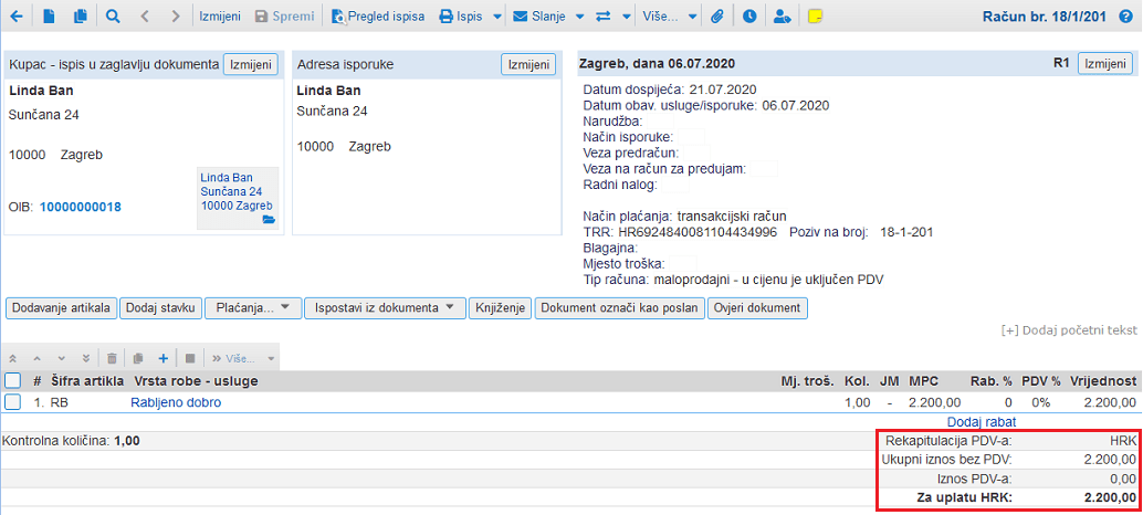 Kao što je to propisano, na izdanom se računu ne iskazuje izdvojeno iznos PDV-a: