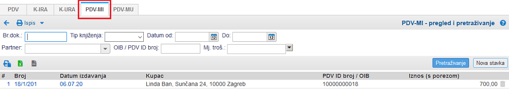 Na temelju zapisa na izlaznim računima, automatski se generira obrazac PDV-MI: