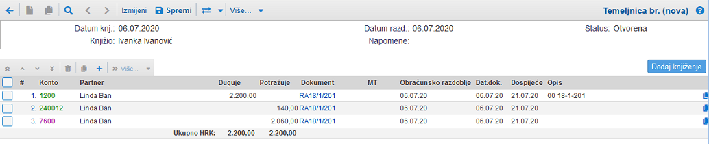 Iznosi po izlaznom računu, uključujući izračunat iznos PDV-a, automatski se prenose pri knjiženju na temeljnicu u glavnu knjigu: