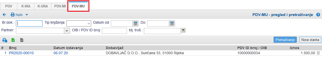 Ako smo unosili ulazne računa za nabavu rabljenih dobara, pri obračunu PDV će se automatski popuniti i obrazac PDV-MU: