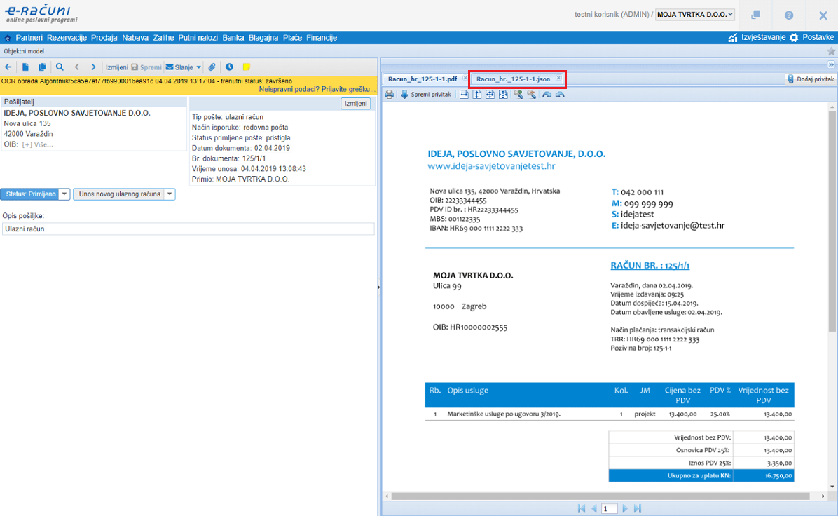 Po završenoj OCR obradi, kreira se datoteka, kao što je vidljivo iz priložene slike (gore), kojom je omogućen automatski prijenos tj. učitavanje ulaznog računa u modul Nabava – Ulazni računi, bez potrebe za ručnim pretipkavanjem podataka.