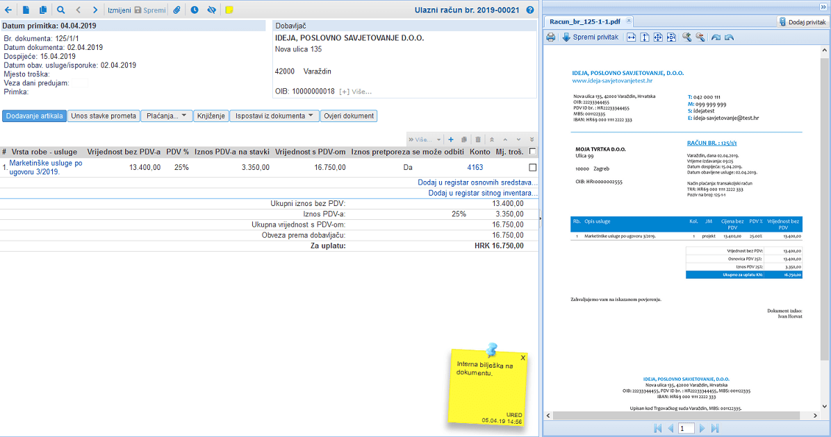 Po automatskom prijenosu dokumenta – ulaznog računa u evidenciju u modulu Nabava, na ulaznom se računu nalazi i privitak, koji pruža uvid u original dokumenta na temelju kojeg je izvršena OCR obrada (to je dokument kojeg ste slali u OCR obradu) i učitavanje podataka u evidenciju primljenih računa: