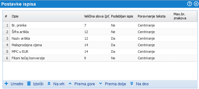 Primjer zadanih atributa za ispis naljepnica sa cijenama: