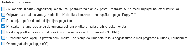 U postavkama tvrtke na raspolaganju su i dodatne mogućnosti, a koje se odnose na slanje izlazne pošte. Slika u nastavku prikazuje raspoložive postavke, koje možete označiti (ili odznačiti):